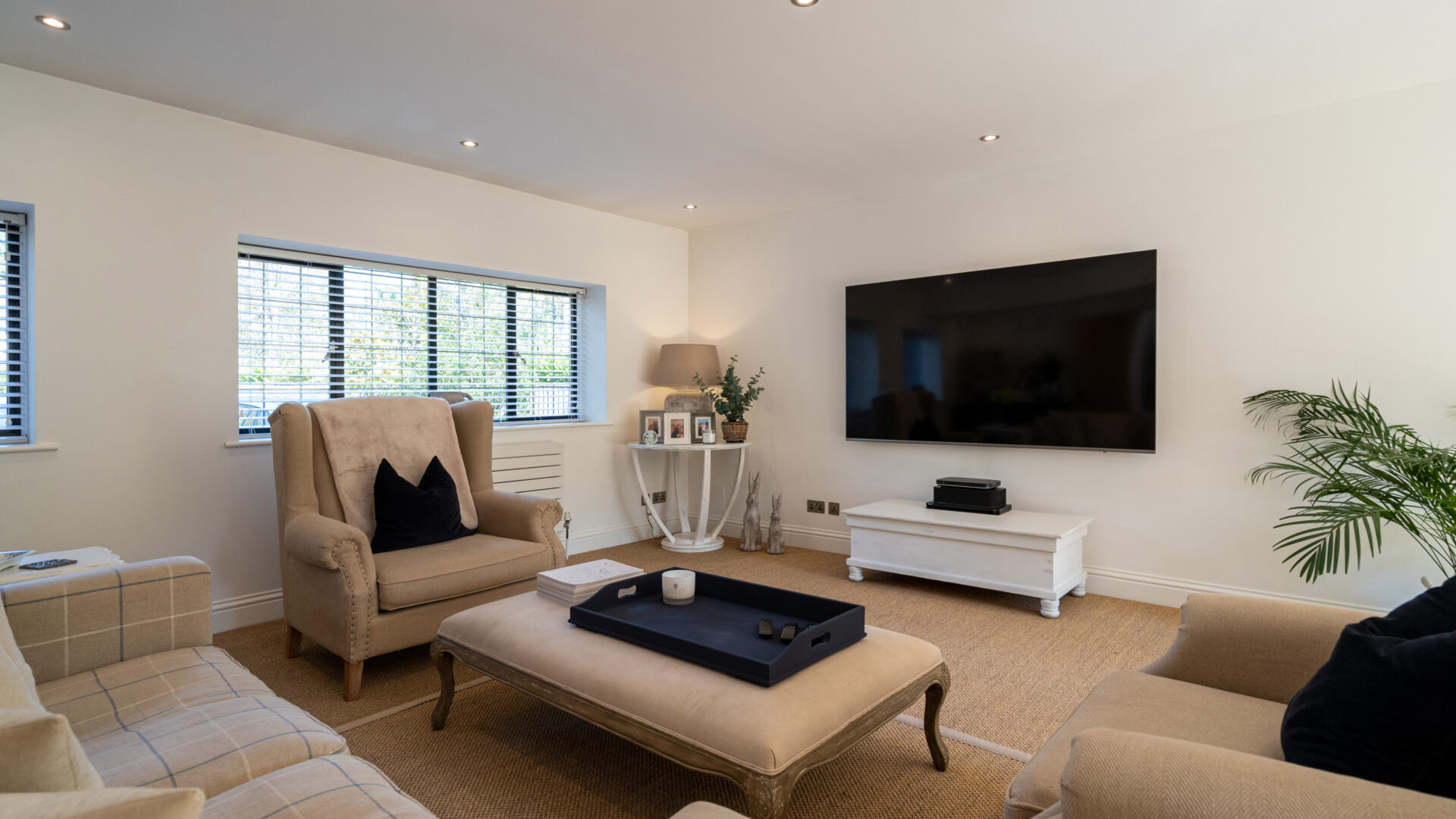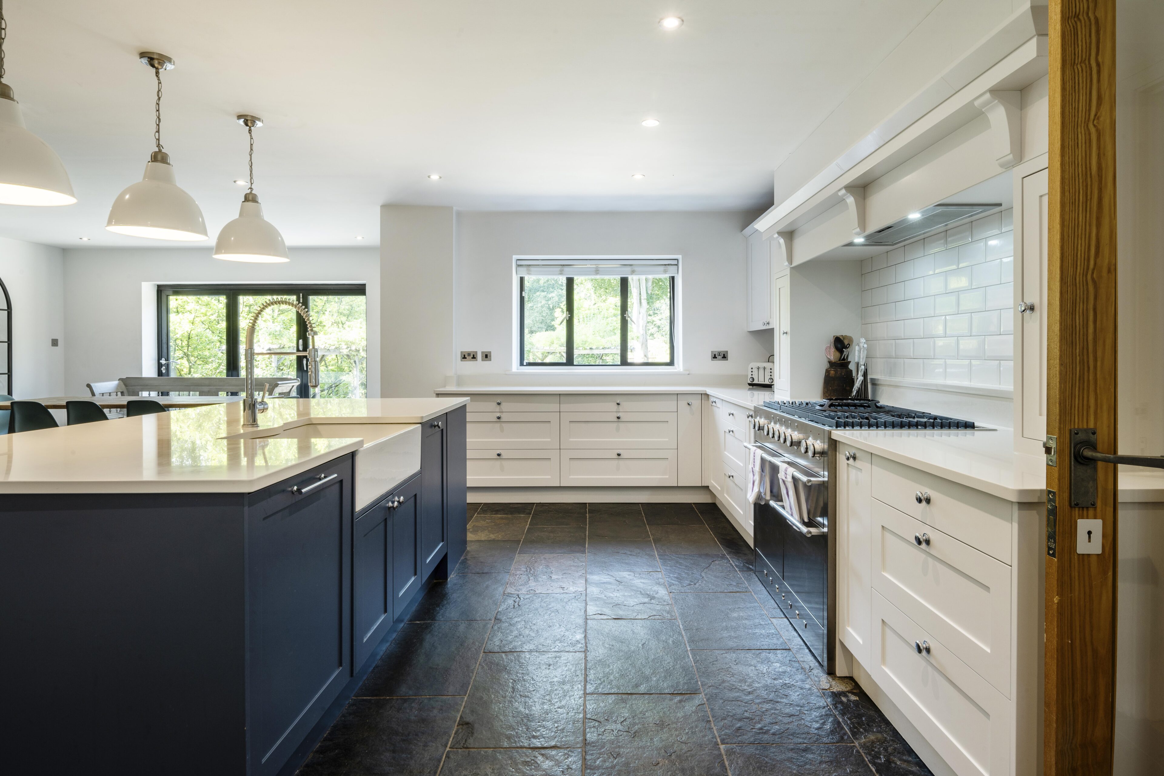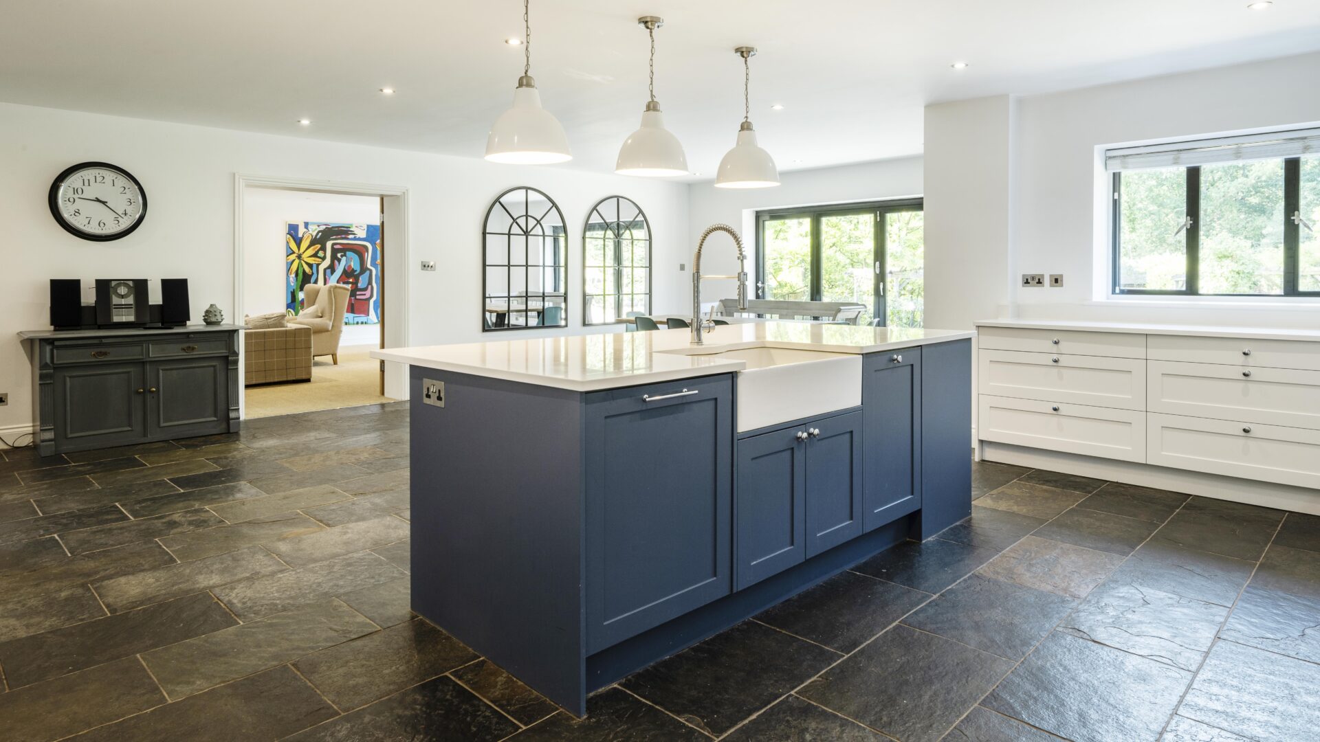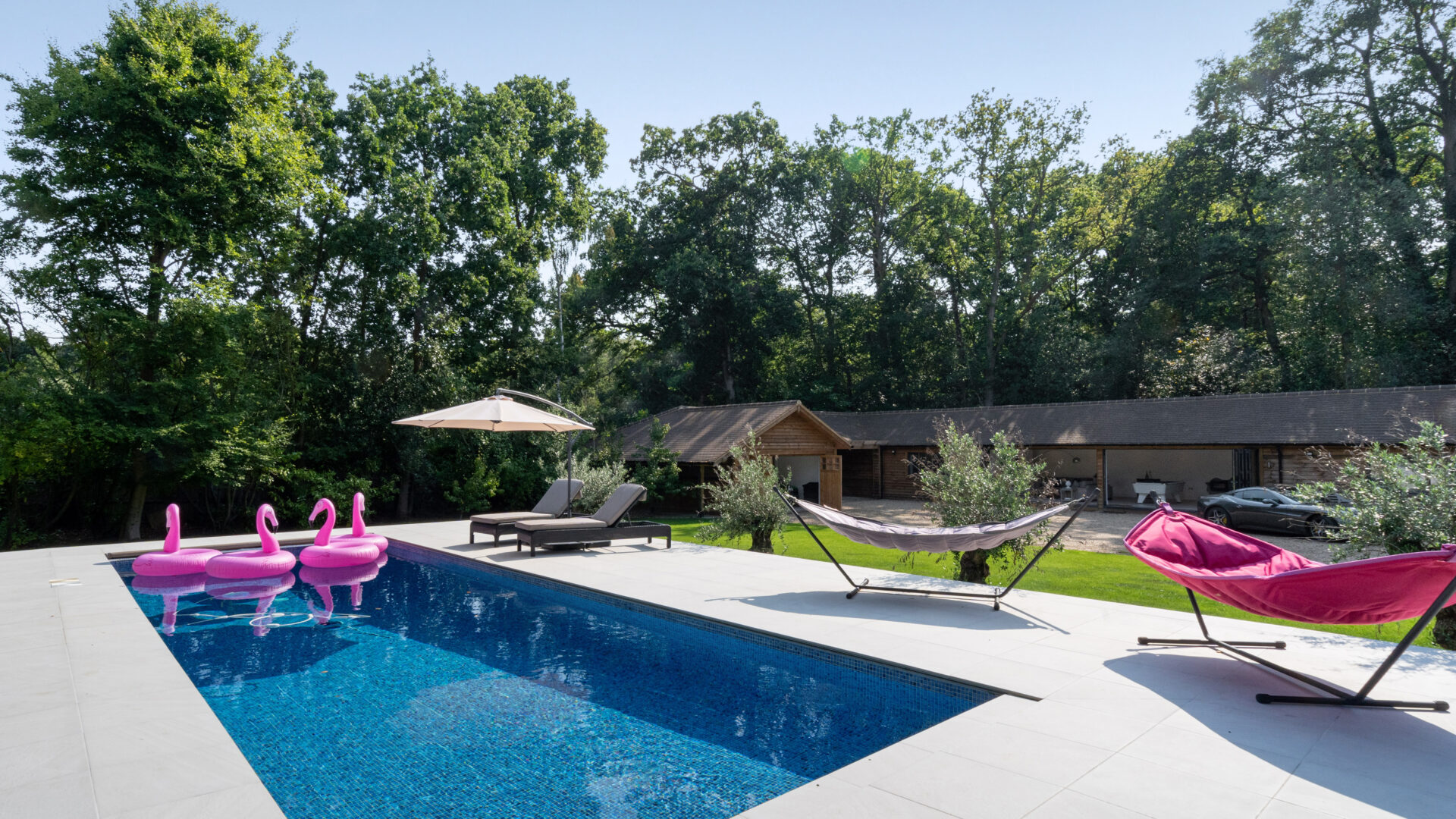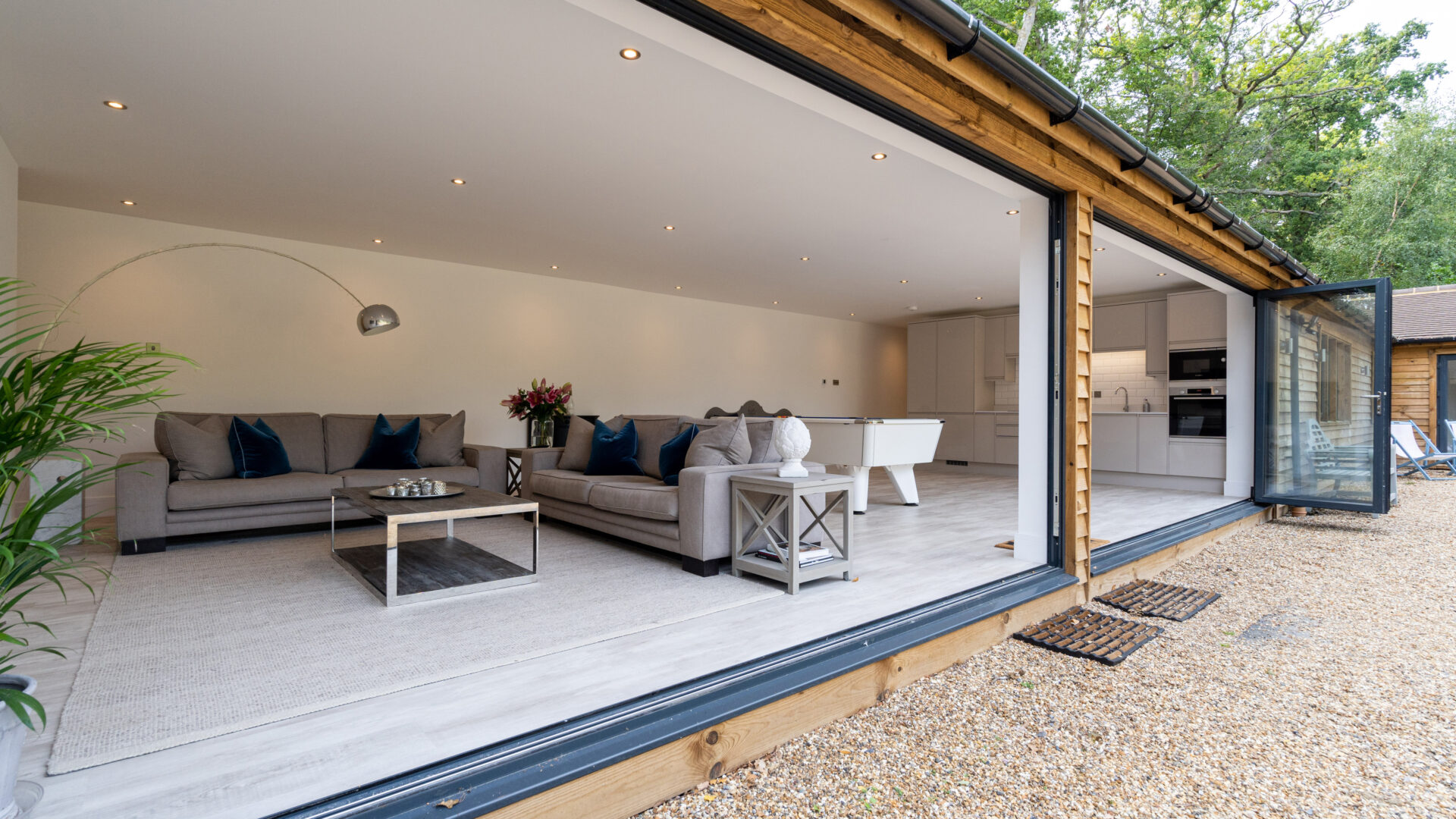 THE LODGE The recently completed Lodge is a beautiful single storey, timber clad building of over 3,000 sq ft, which includes two bedroomed en suite accommodation, a substantial entertaining space complete with kitchen with bi-fold doors that overlook the swimming pool, a gym with sauna, a car port and a feature garage complete with glazed viewing area and underfloor heating. The Lodge provides a versatile space to use for entertaining or as additional accommodation. It is served by its own boiler and has underfloor heating throughout.
